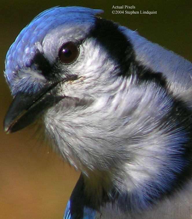 The head of the Blue Jay above is a crop of the photograph below which shows the actual pixel detail. Taken