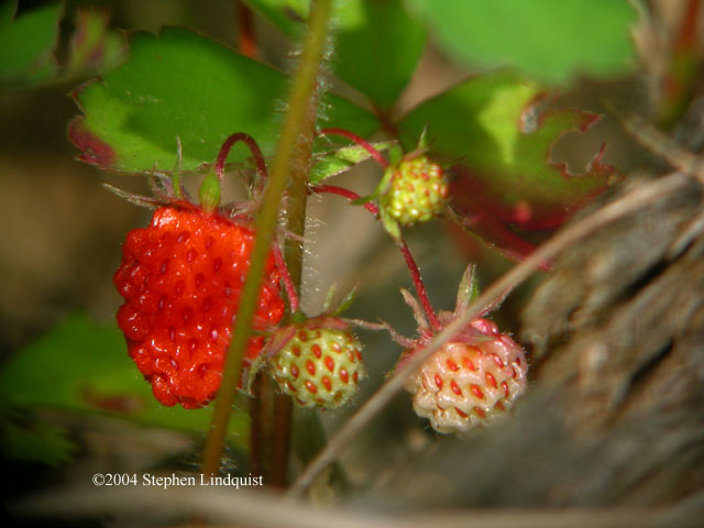 | Uncropped photograph of a wild strawberry, the largest one in this picture is about .75 inches long. Taken from about 8 feet, using daytime flash. |